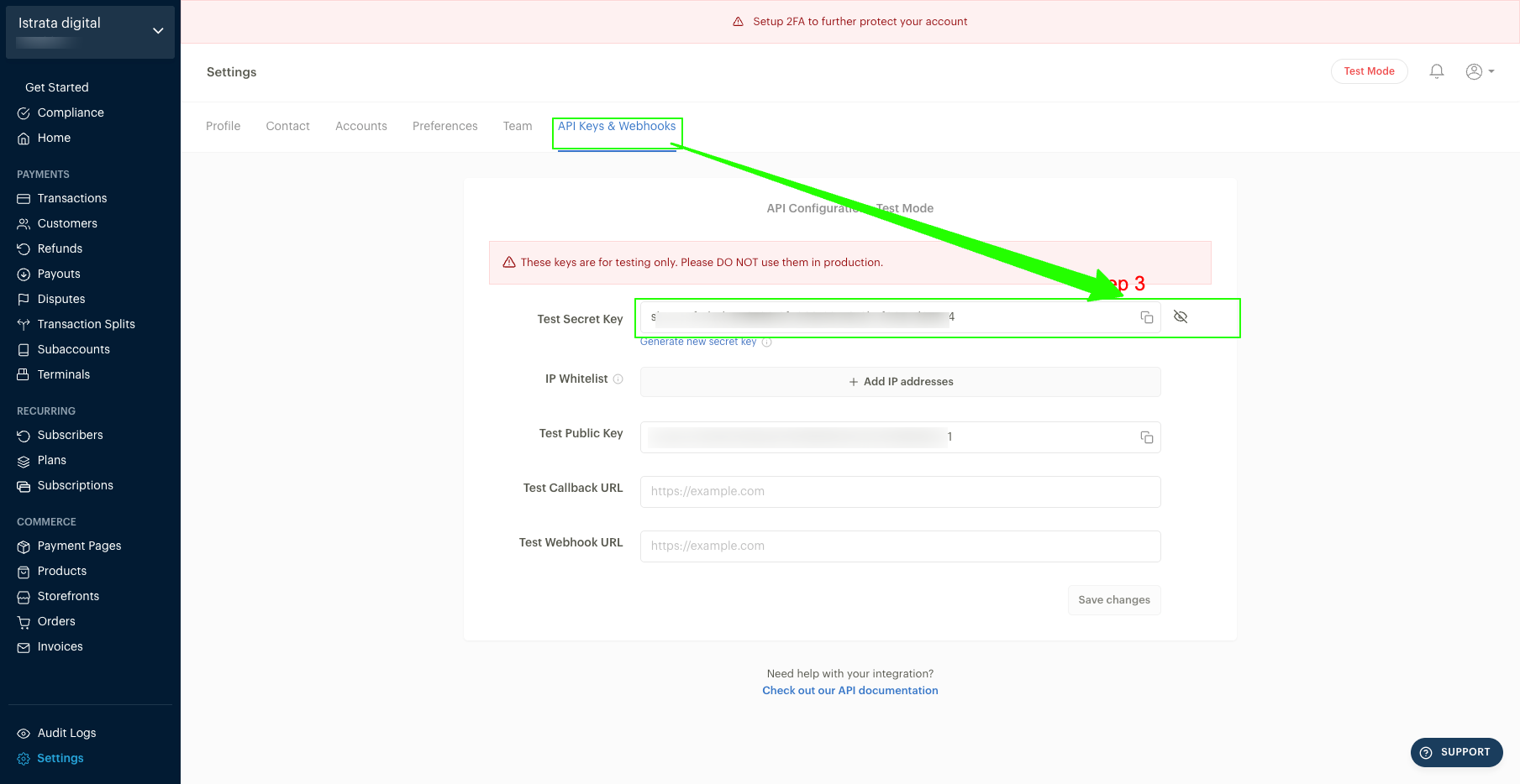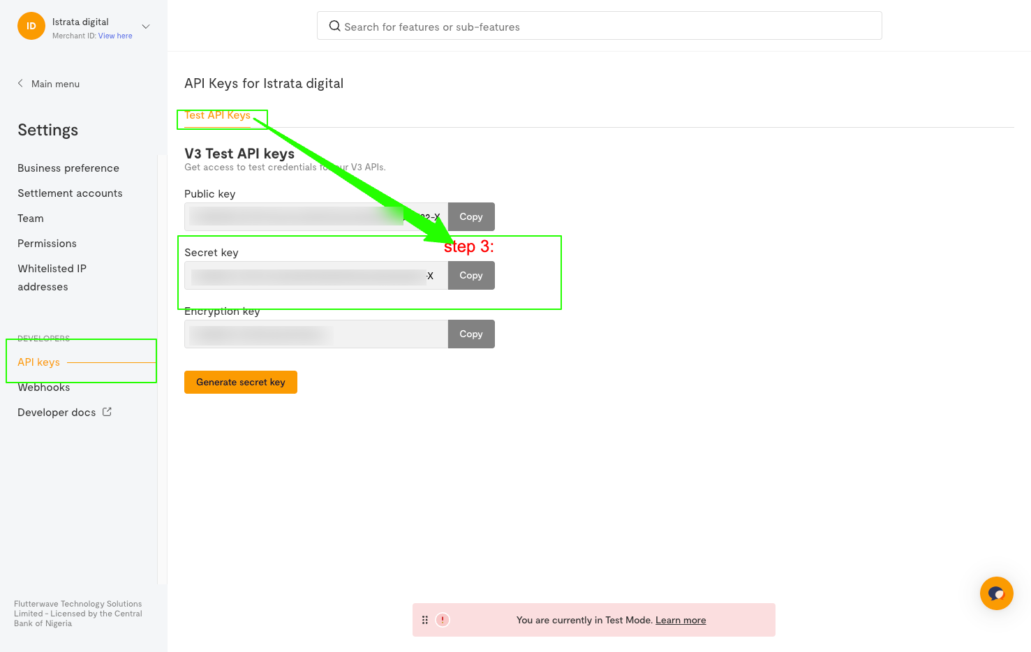 Use Sandbox Secret Key for testing & Live Secret Key when your platform goes live.