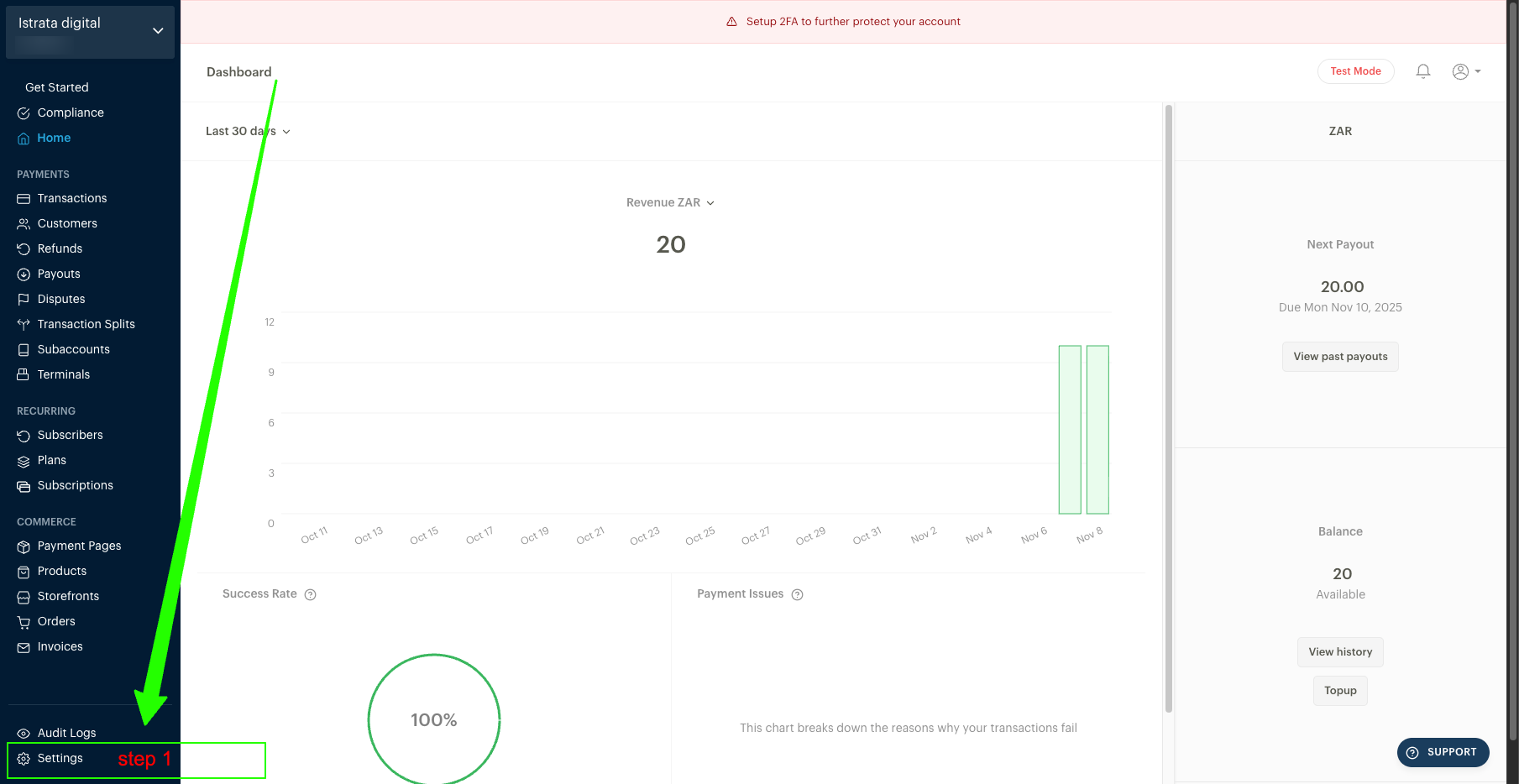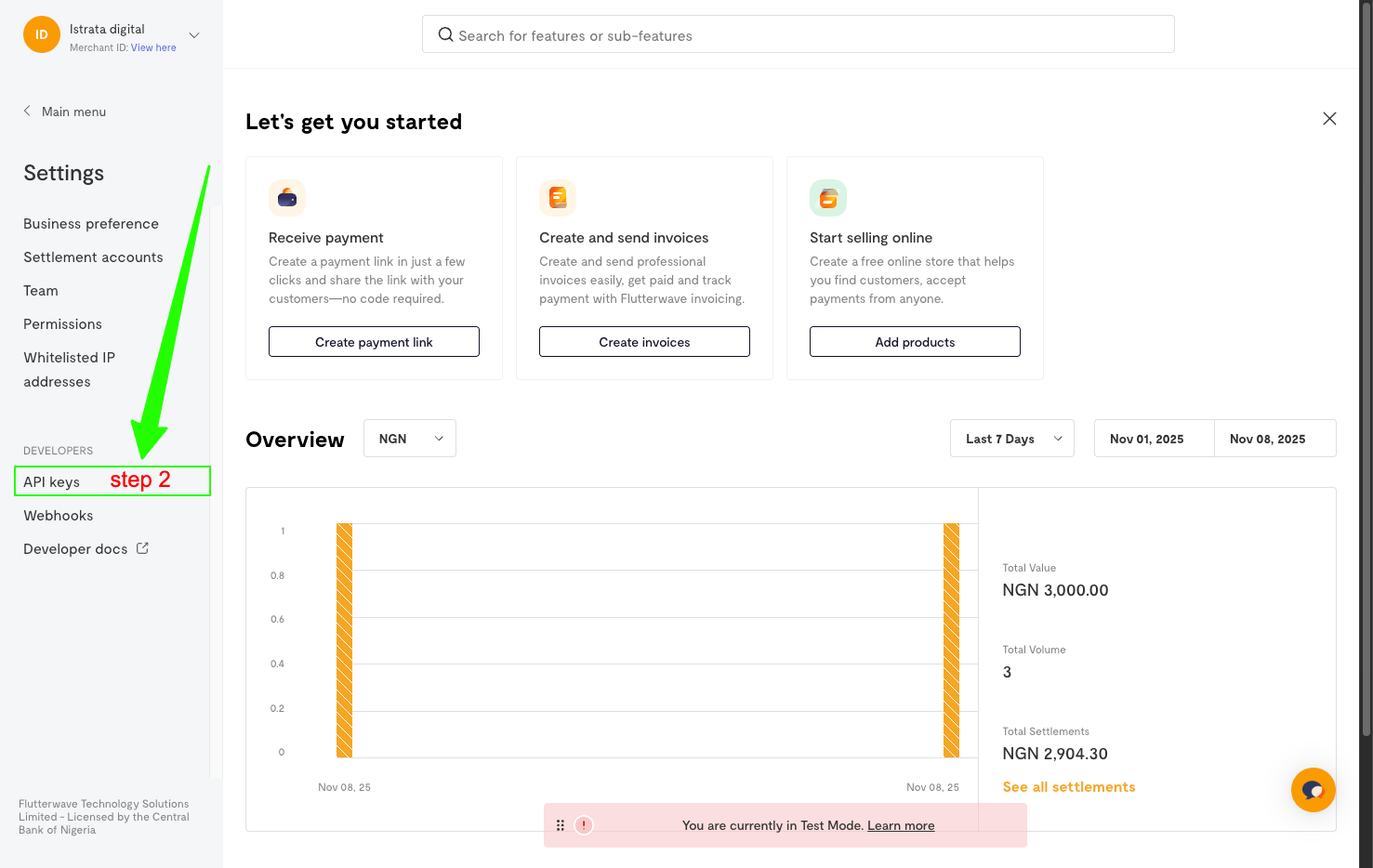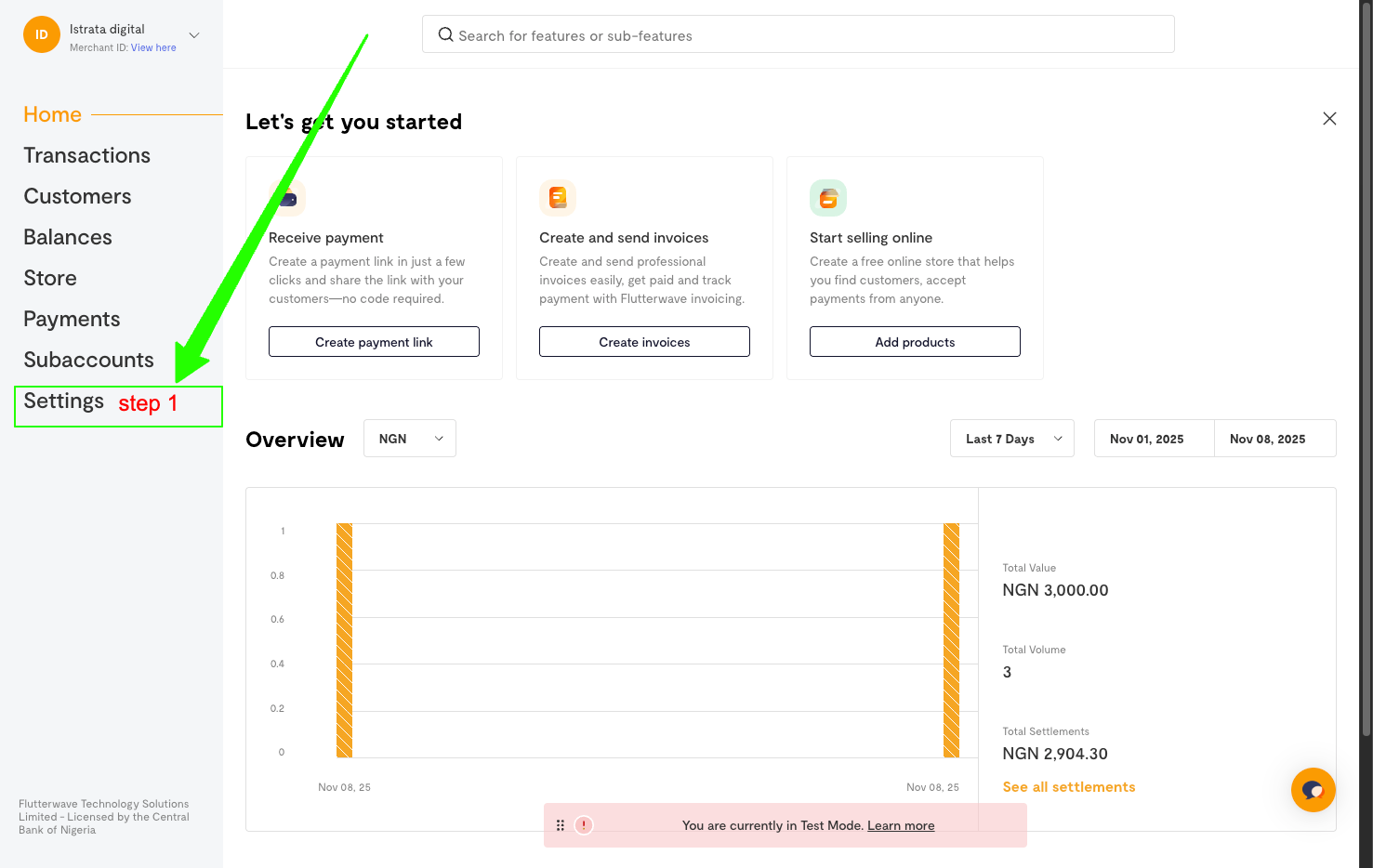 From the left sidebar > click Settings : https://merchant.korapay.com/dashboard/home