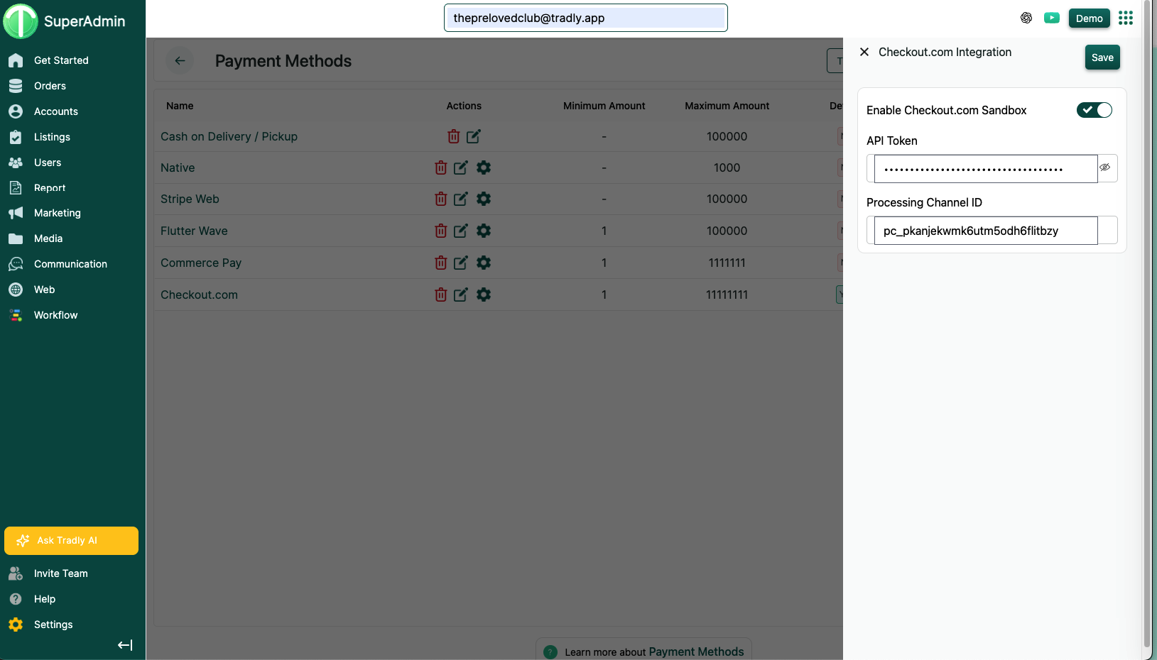 Enable Sandbox Mode in Tradly Checkout.com settings